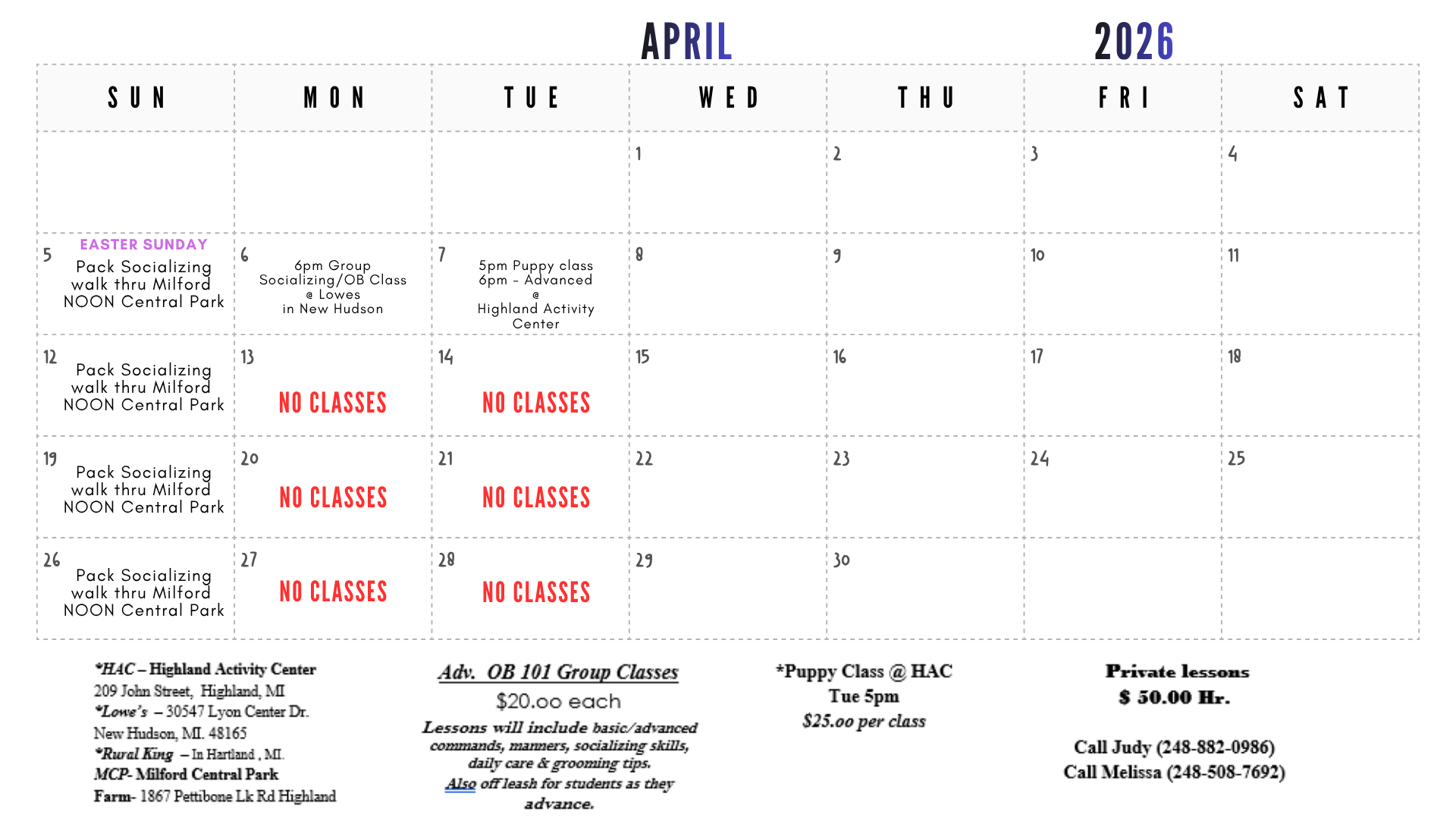 Group Classes - Lessions will include basic/advanced commands, manners, socializing skills, daily care & grooming tips. Off leash for students as they advance.