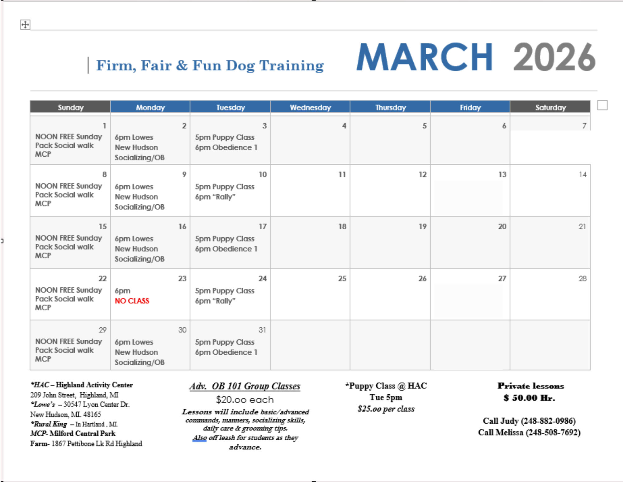 Firm, Fair & Fun Dog Training Schedule